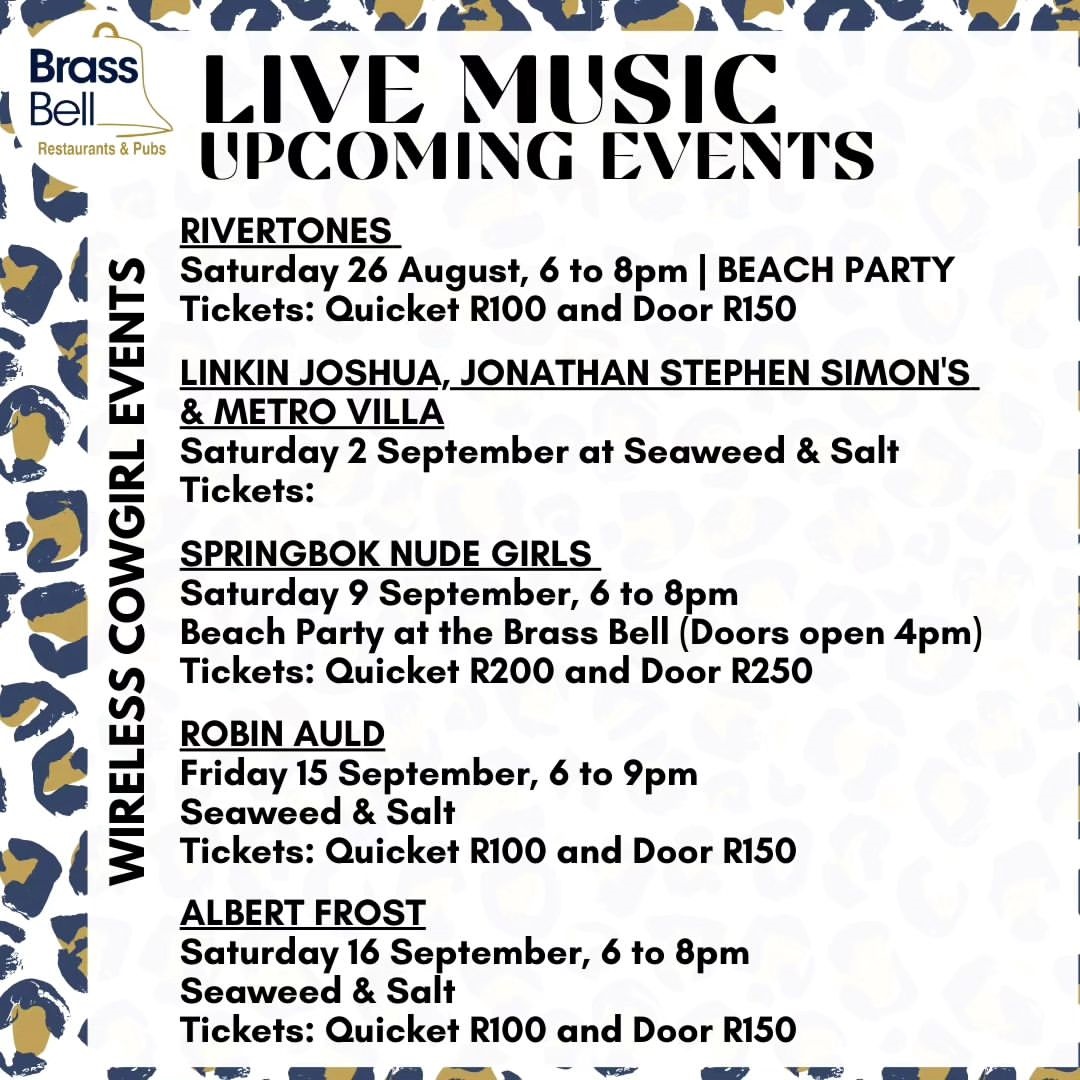 • Saturday, 26 August invites you to the Rivertones from 6 pm to 8 pm. Secure your spot for R100 on Quicket or R150 at the door.