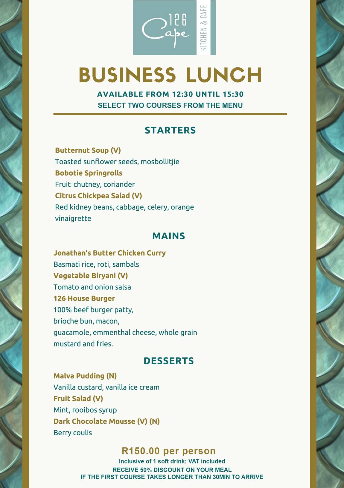 Or if you’re business-minded, bring that all-important meeting to the 126 Cape Kitchen and Cafe for a set business lunch menu for only R150 per person.