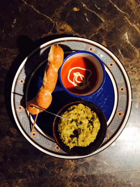 South African tomato soup with green chillies, garlic and ginger, served with crisp,  salted Masala breads twirls.