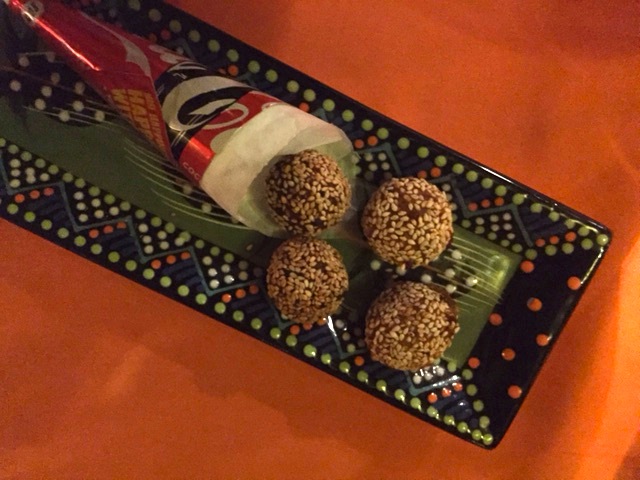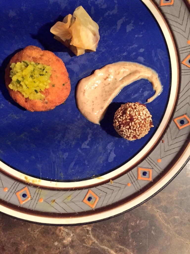 Sweet potato, ground spices then rolled in sesame seeds and cooked. This were little puffs of deliciousness. I loved the sweetness of the potato combined with the nutty seeds.
