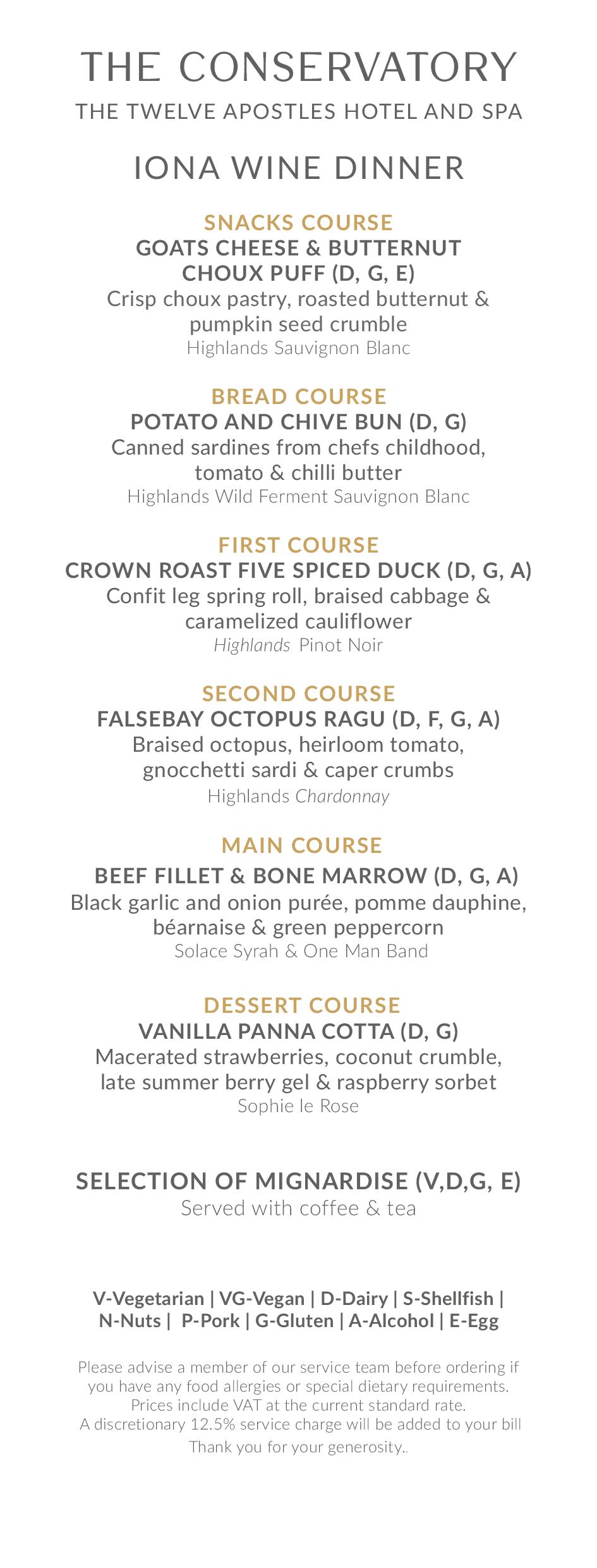- This curated experience features a seven-course gourmet menu, each dish thoughtfully crafted to complement five exceptional Iona wines. It’s not simply a dinner; it’s a guided journey through flavour, balance and storytelling — where every plate and every pour has purpose.