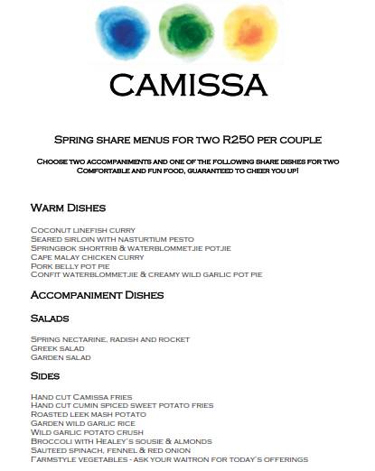 This is the philosophy at Camissa Brasserie when they developed their sharing menu which boasts many of their favourite dishes. You get to choose one warm dish with any two accompaniment dishes. This is comfort food at its best, guaranteed to warm you up.