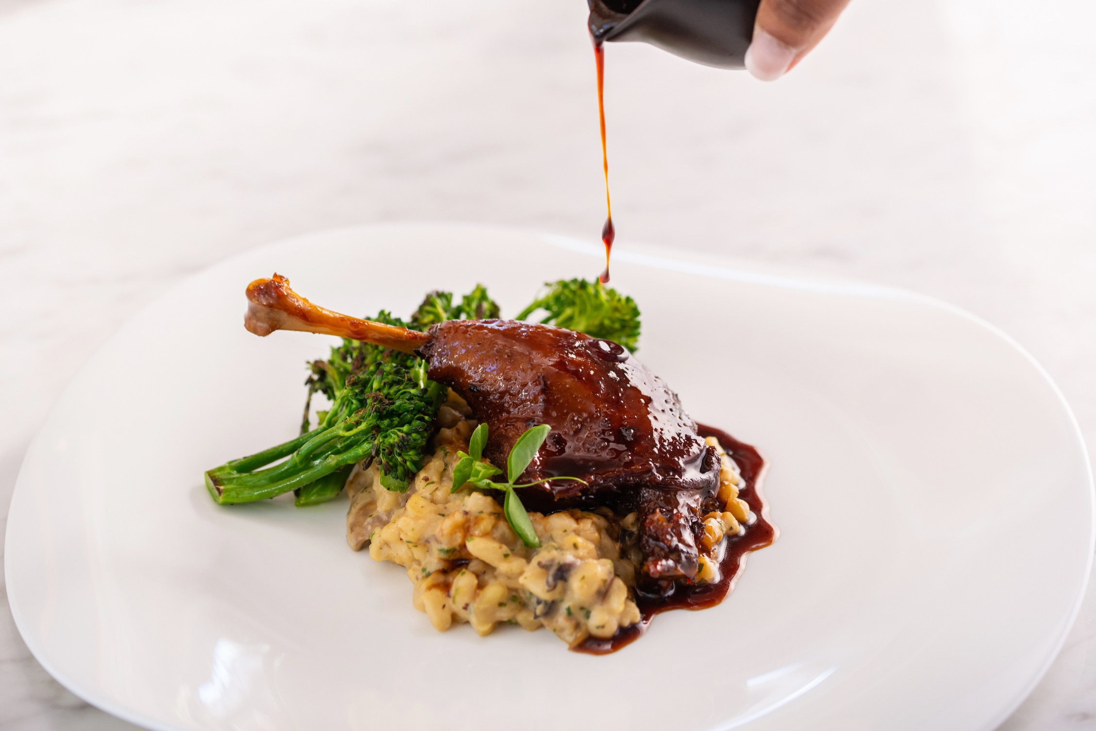 Mains include an Asian cured duck breast with creamy samp and mushroom risotto, a slow braised beef short rib with potato pave and seasonal vegetables, and sustainable line fish with Thai green curry sauce.