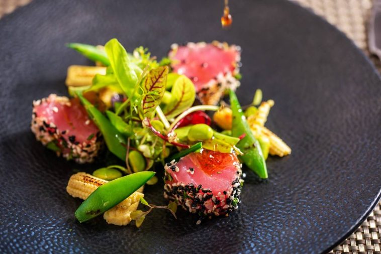 The bread course includes traditional Xhosa inspired steamed buns, similar to an Asian bao with flavoured butters. The starter goes Afro-Asian with a sesame seed crusted and seared tuna with charred baby corn, edamame beans, and compressed cucumber with sweet soy dressing.