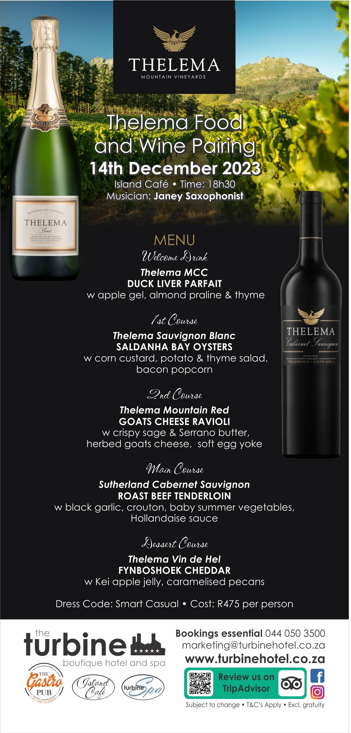 Enjoy in a night of culinary enchantment at The Turbine Boutique Hotel & Spa’s Wine & Dine evening on December 14th, featuring the exquisite wines of Thelema.
