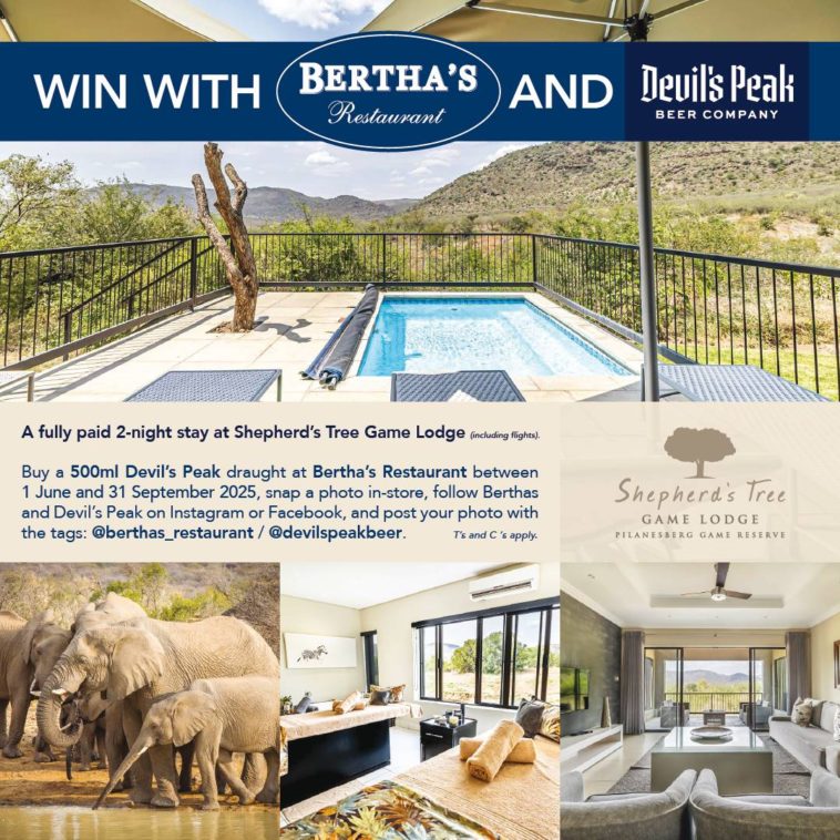 From 1 June to 31 September 2025, every 500ml Devil’s Peak draught enjoyed at Bertha’s brings you one step closer to a fully paid 2-night stay at Shepherd’s Tree Game Lodge in the stunning Pilanesberg Game Reserve—flights included!
