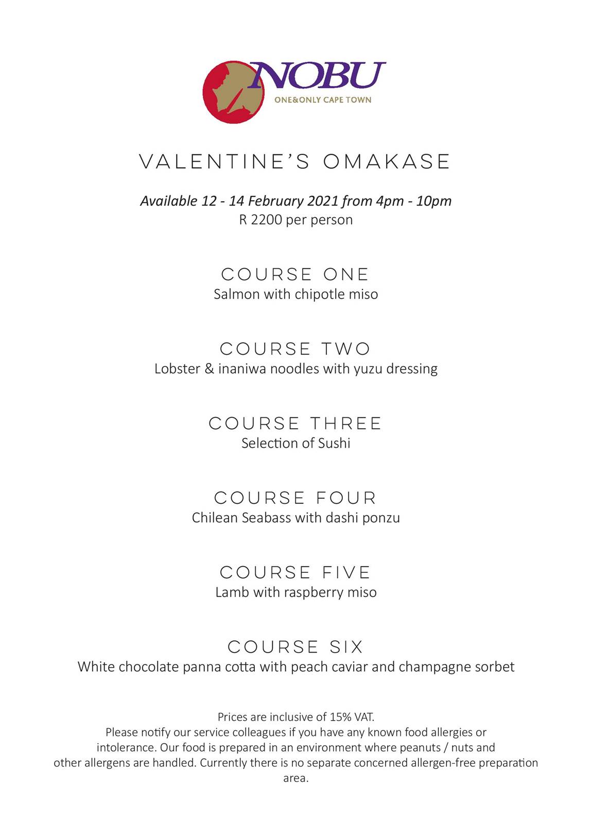 Celebrate Valentine’s Day at Nobu Restaurant from 4pm – 10pm with a six course Omakase (‘from the heart’) dinner lovingly created by the Chef for your romantic dining pleasure.