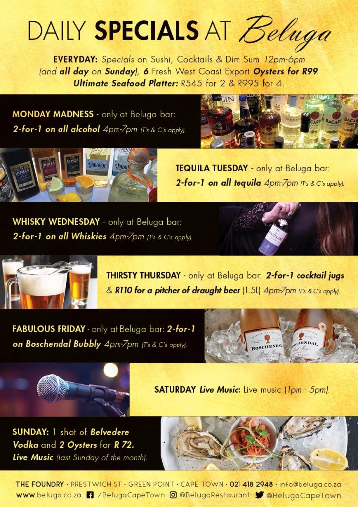 Daily drink specials have been introduced as well starting with Monday Madness where ALL alcohol (T&Cs apply) are on offer on a 2-for-1 special (from 4pm to 7pm). Moving on to Tuesdays, it’s all about tequila, and Wednesdays there is a 2-for-1 special on all Whiskeys. On Thursdays, you can enjoy 2-for-1 cocktail jugs while a pitcher of draught beer is available for only R110. Friday offers a special on 2-for-1 Boschendal Bubbly from 4pm to 7pm. The weekend features live music from 1pm; and 1 shot of Belvedere Vodka and two Oysters for R72 on Sundays.