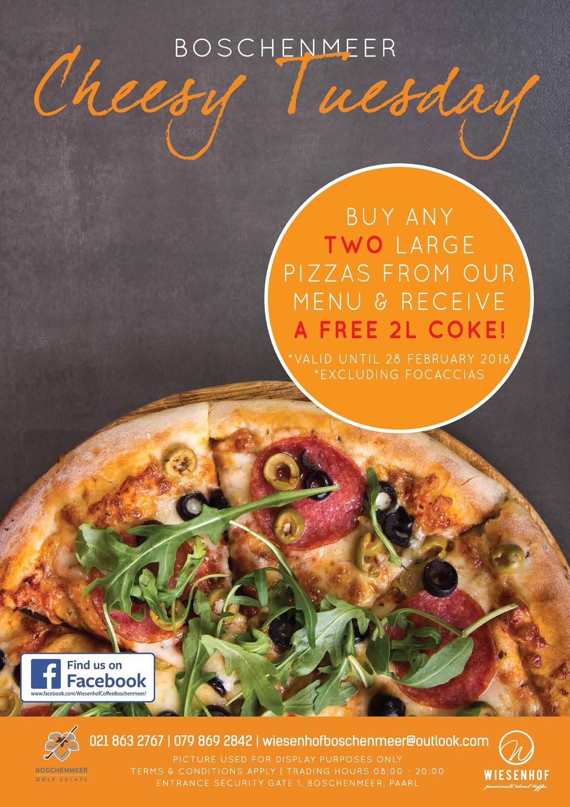 • Tuesdays: Receive a 30% discount for any 2 large pizzas
