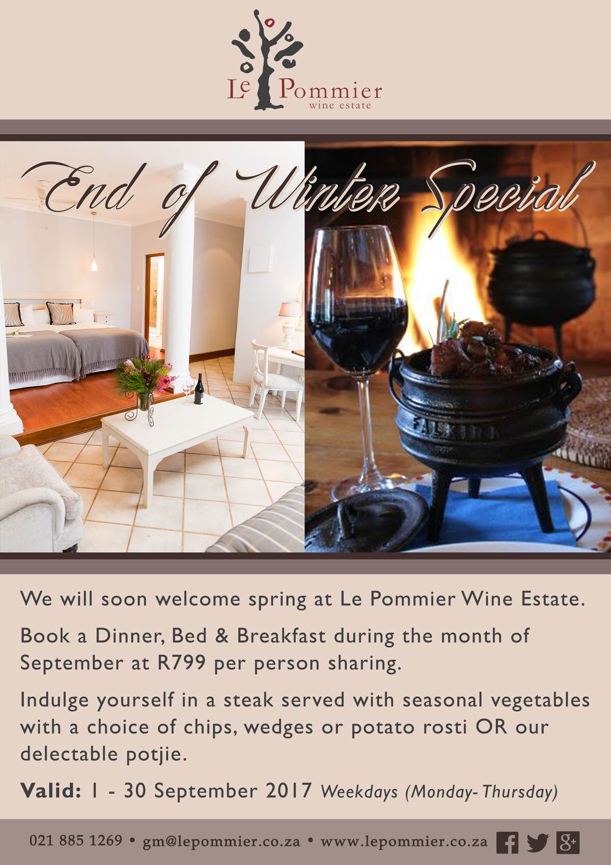 The Le Pommier Wine Estate will be offering a Bed & Breakfast special for only R799 per person sharing per night, – great value to allow you to escape the noise of the busy city and relax in the Cape Winelands enjoying delicious food and excellent wines. This promotion includes dinner, stay and breakfast and is available every Monday – Thursday during September.