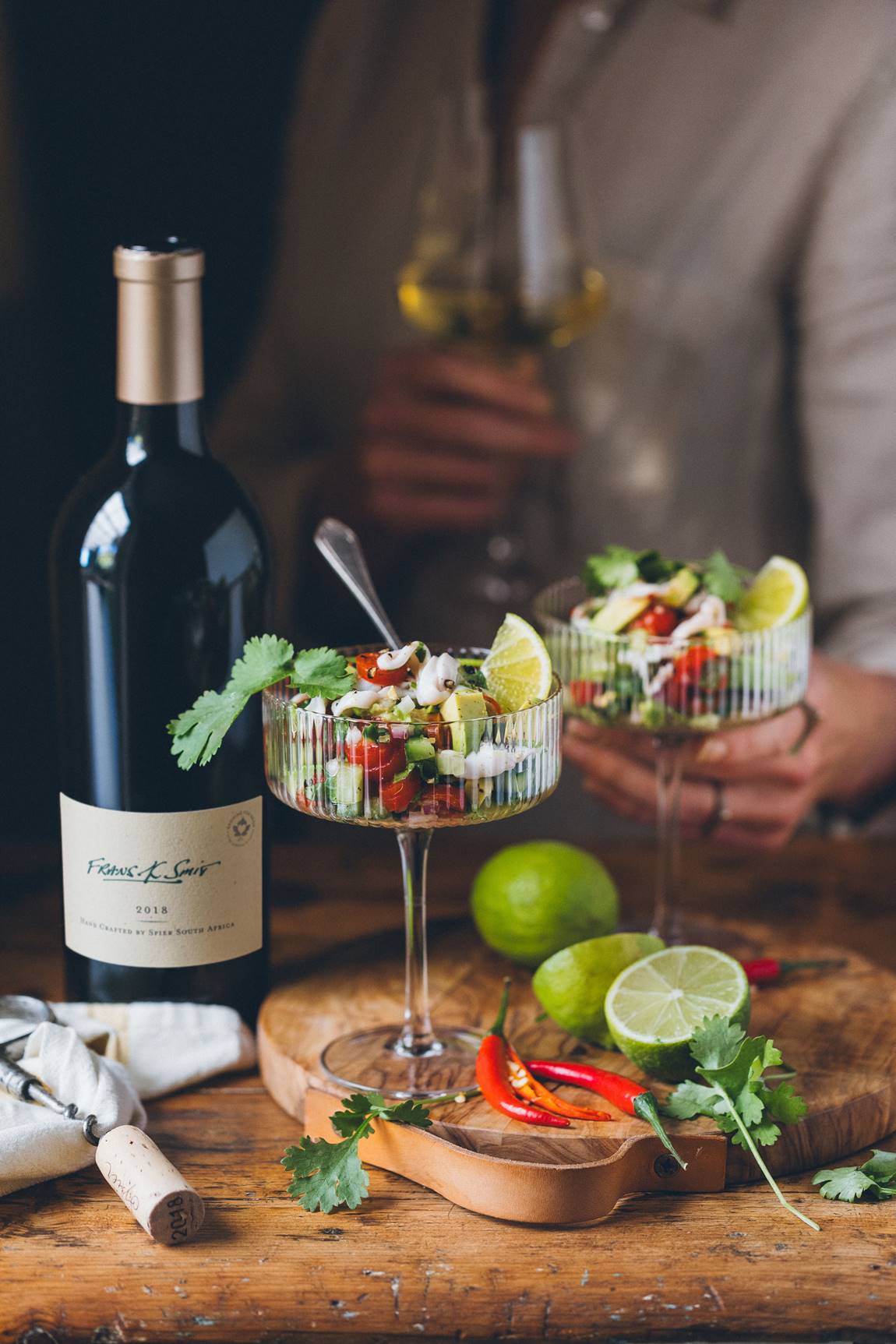 - Place the prepared cucumber, avo, tomatoes, red onion, spring onion, chilli, and coriander in a wide bowl. Add the drained cured squid, pour over the olive oil, season with salt and pepper, then stir well. Keep covered in the fridge until ready to serve, then serve with cold lime wedges on the side.