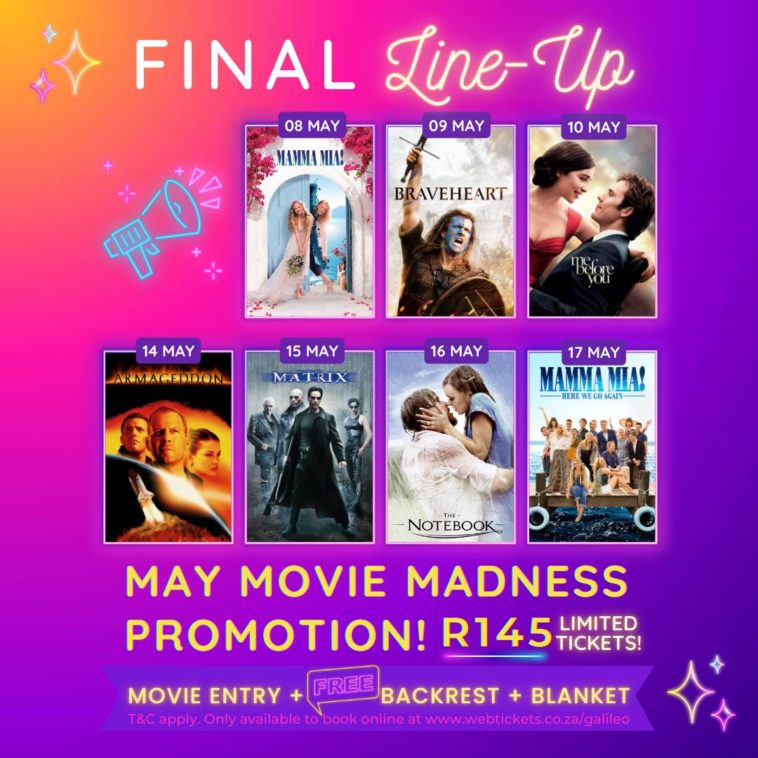For just R145, you’re not only getting movie entry, but also a free backrest and blanket, which means you can lounge like a legend while watching the likes of Braveheart or Mamma Mia under the night sky.