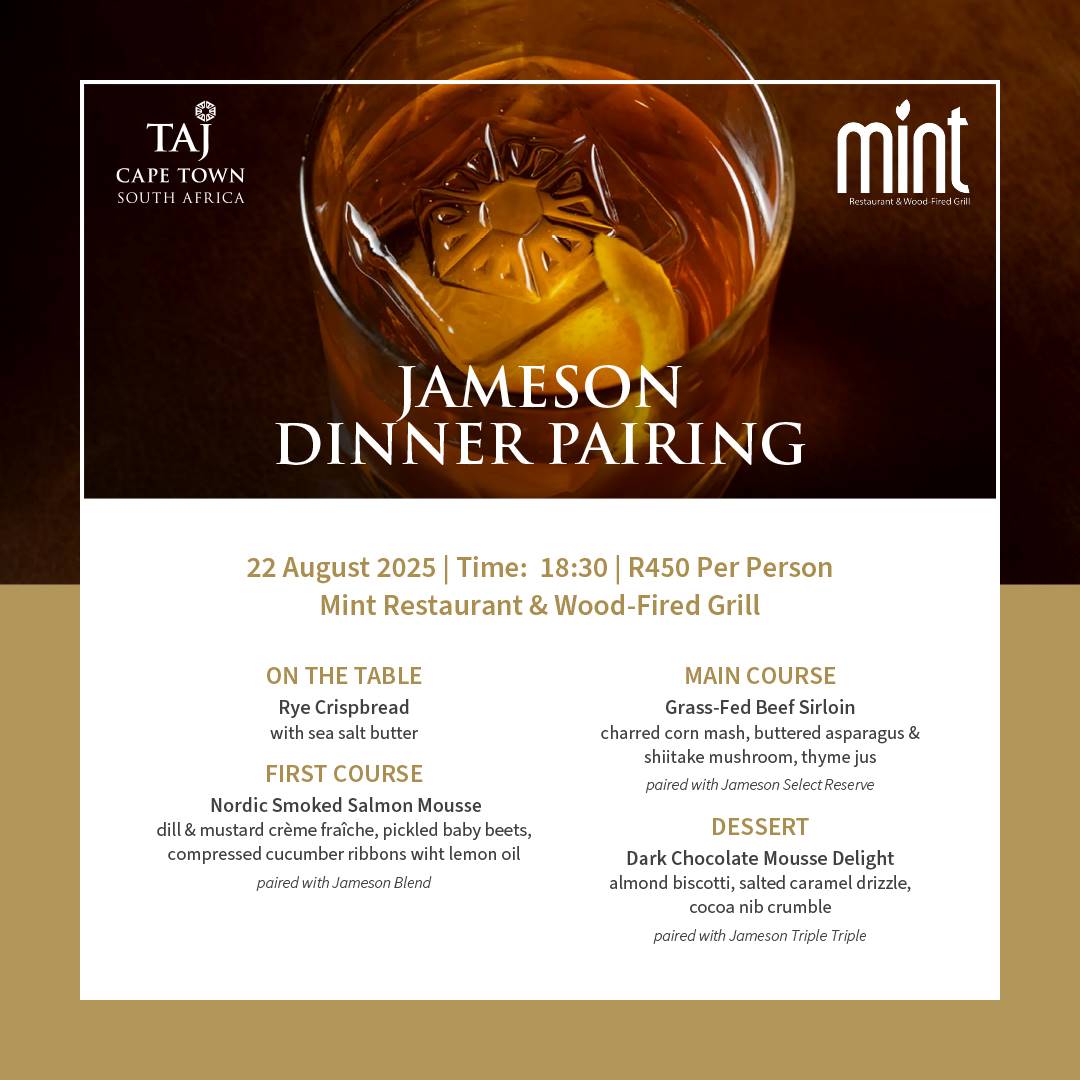 The Mint Restaurant & Wood-Fired Grill at Taj Cape Town is hosting a Jameson Dinner Pairing that’s pure gold for food lovers and whiskey fans alike.