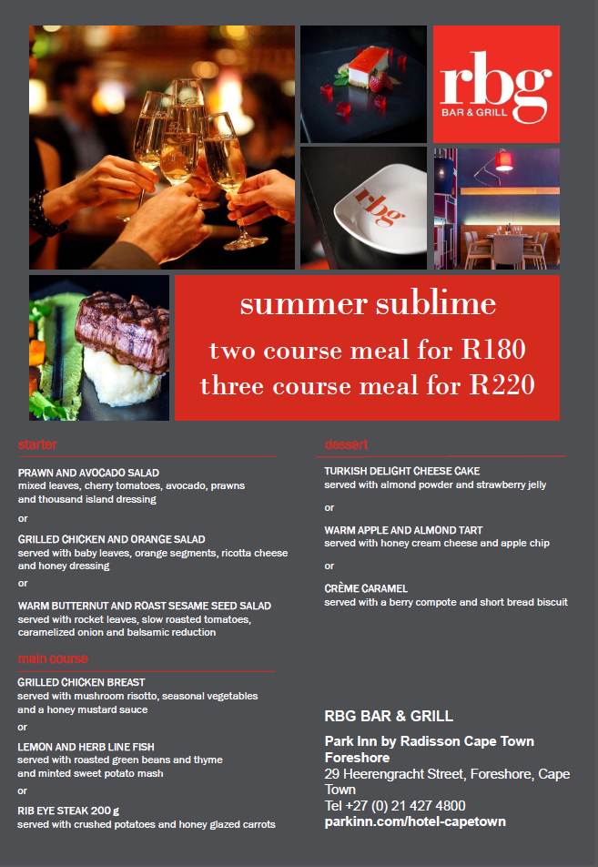 The RBG Grill & Bar has released their new summer set menu special; where you will receive two courses for only R180, with 3 courses available for R220. The menu is a delight and perfect for the warmer season with a range of salads to choose from as a starter. Things get serious when looking at the mains, the 200g rib-eye definitely caught my attention. If there is still space, a Turkish delight cheese cake or a warm apple and almond tart is always welcome.
