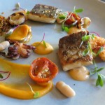 Sauce bouillabaisse, calamari, chorizo crumble, white beans, orange gel, mussel, crispy prawn