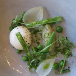 Peas, pickled onion, confit shallot, mint oil, chilled pea and Parmesan soup