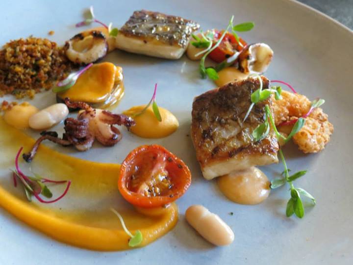 Sauce bouillabaisse, calamari, chorizo crumble, white beans, orange gel, mussel, crispy prawn