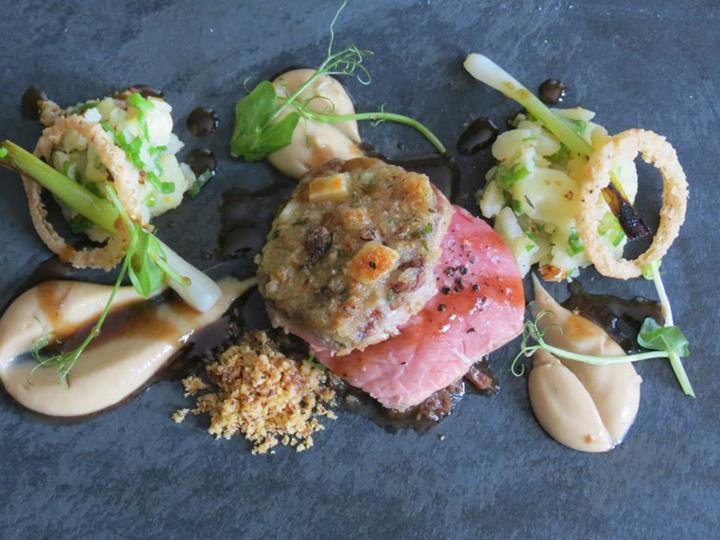 Oxtail, baked onion puree, warm potato salad, barbecued spring onion