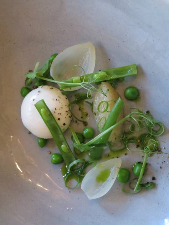 Peas, pickled onion, confit shallot, mint oil, chilled pea and Parmesan soup