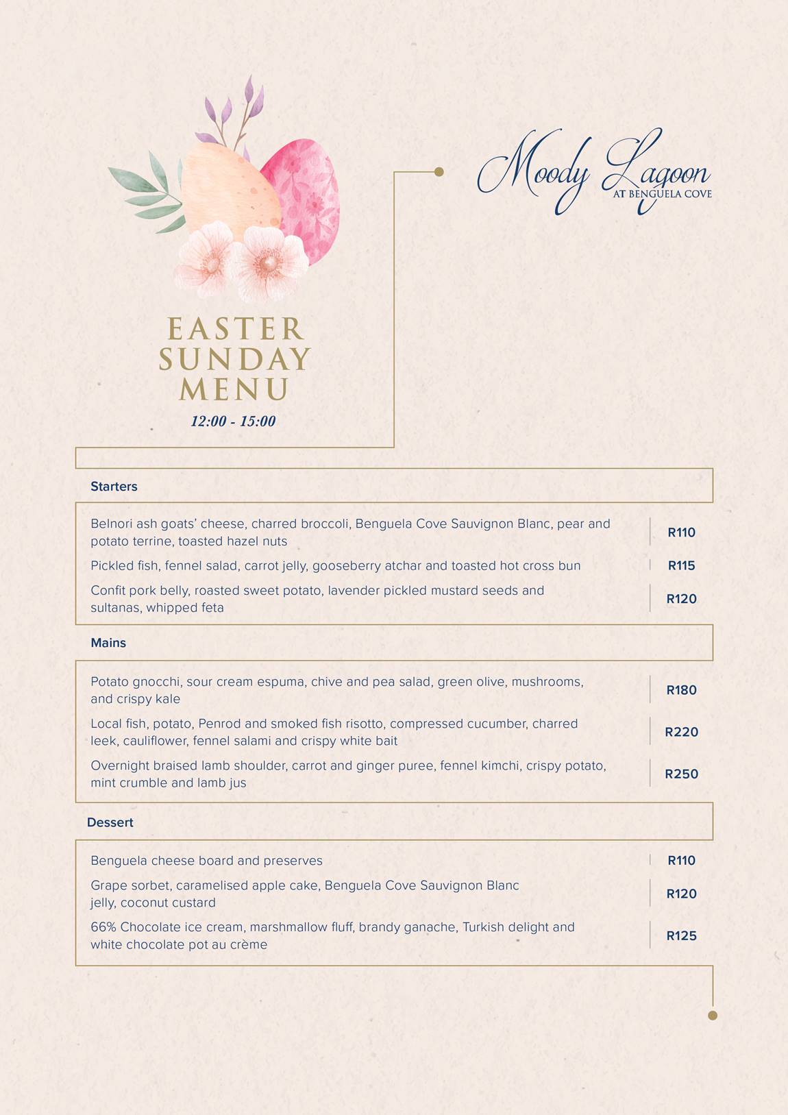 Moody Lagoon Restaurant’s Chef, Annie Badenhorst, has crafted an Easter Sunday Lunch menu that offers something delicious for everyone. Enjoy 3 courses on Sunday, 17 April from 12h00 – 15h00.