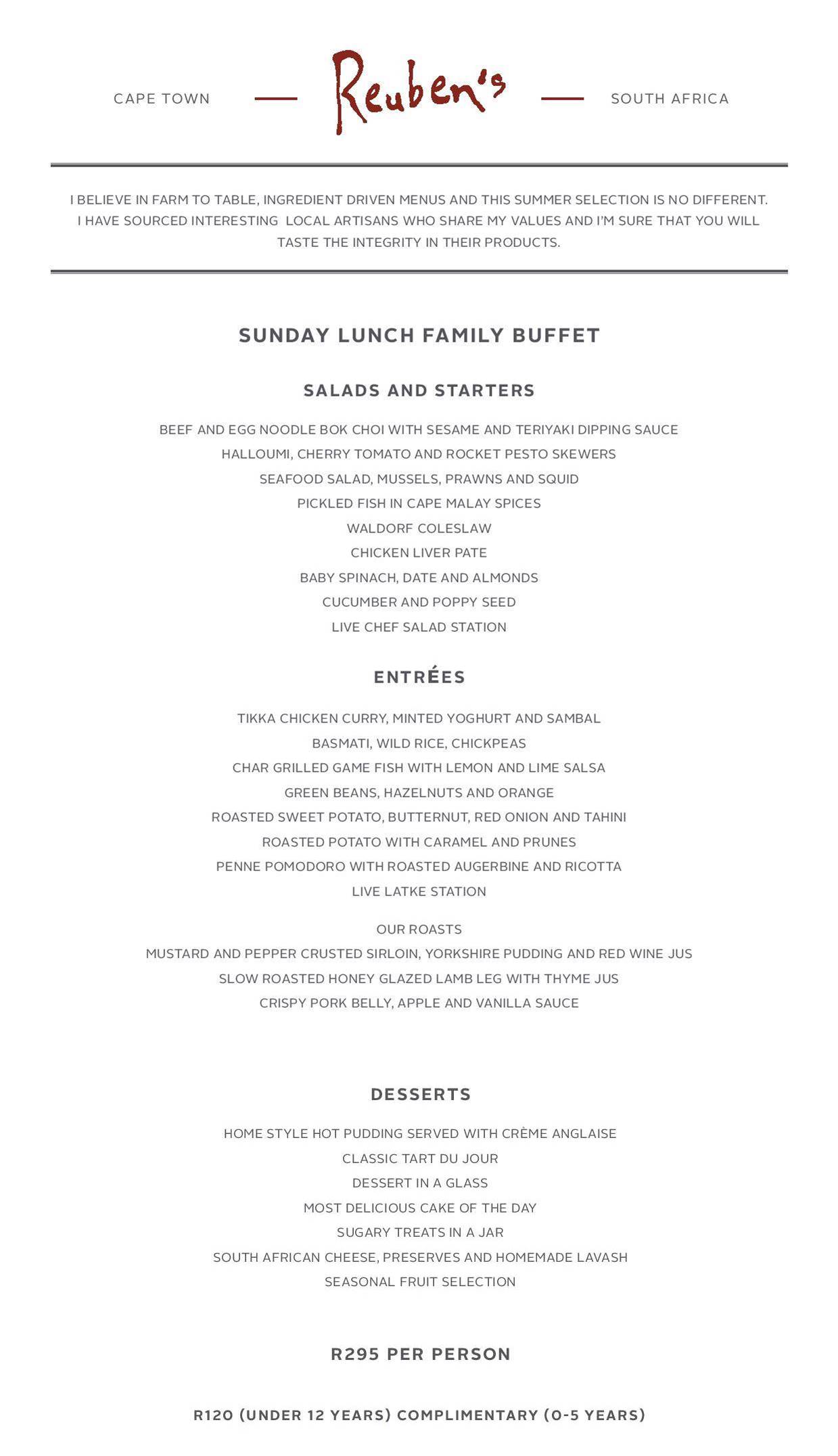 Embark on a culinary adventure with the whole family as South Africa’s favourite Celebrity Chef Reuben Riffel creates an innovative, bistro-styled Sunday Lunch buffet of comfort cuisine that everyone will love. Please note that the menu below is only a sample, and dishes may be removed or added to ensure that only the freshest seasonal ingredients are used.