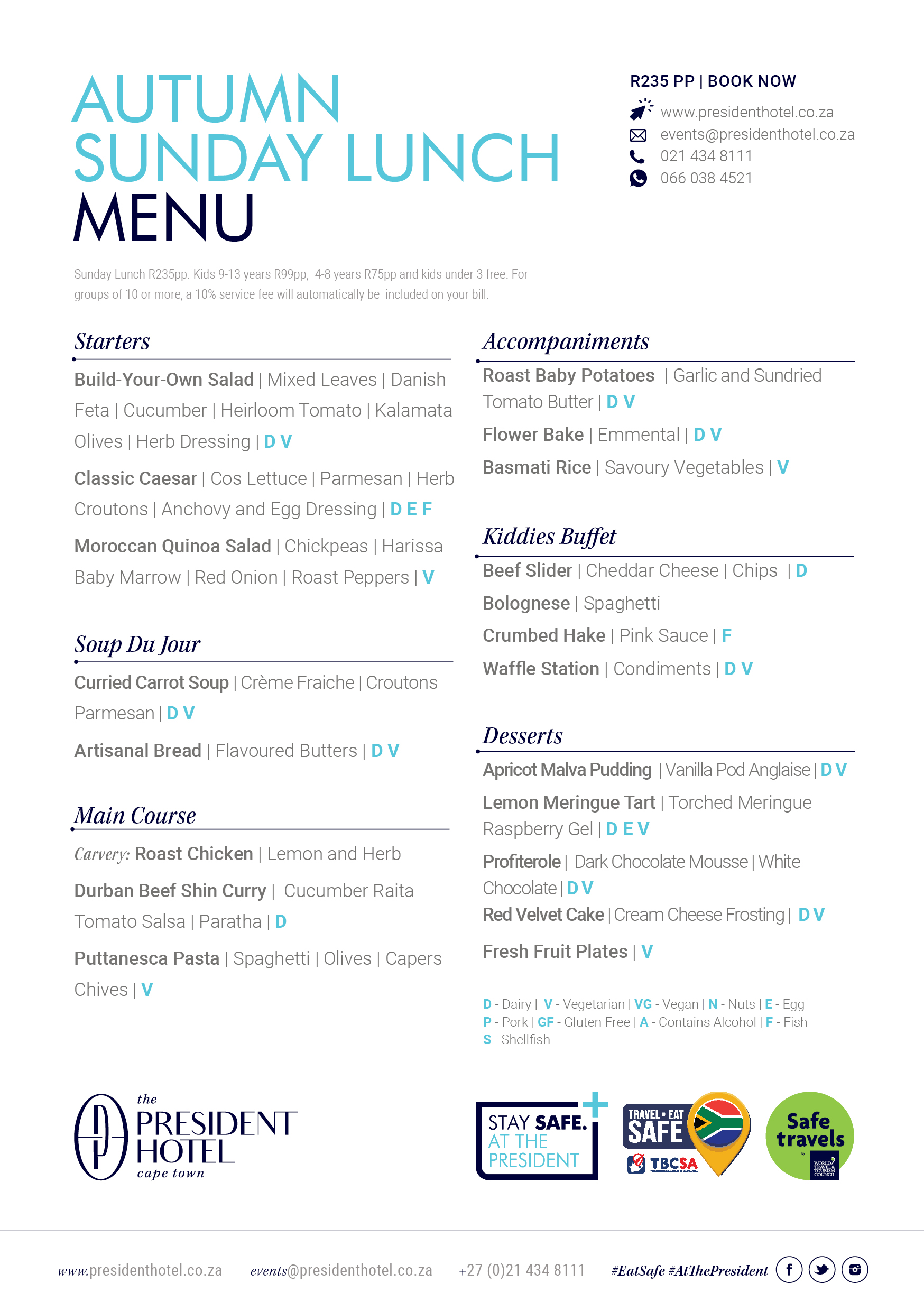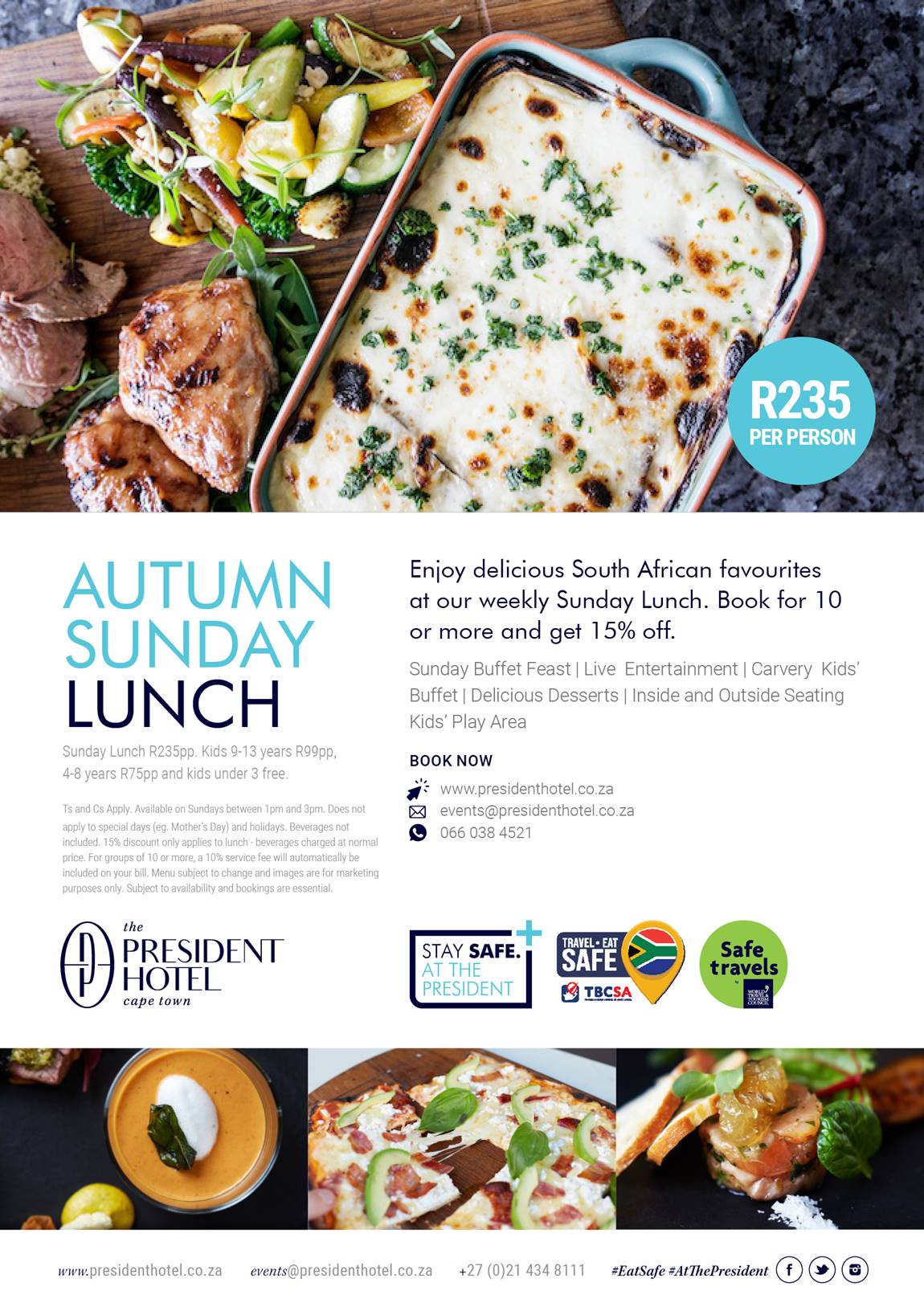 The President Hotel is one of the pillars of the hospitality industry and they know how to please the local palate. They have curated the perfect Sunday Lunch Menu to satisfy your cravings at great value for money. End off the week with a fantastic lunch offering that the entire family will love.