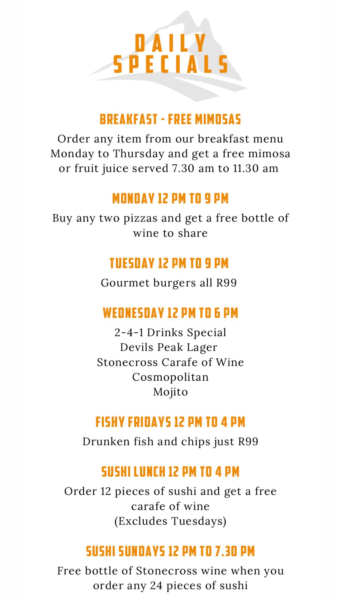 From 12 pm to 6 pm, choose from an array of delightful drinks, including Devils Peak Lager, a carafe of Stonecross wine, a classic Cosmopolitan, or a refreshing Mojito. Cheers to making Wednesdays memorable!
