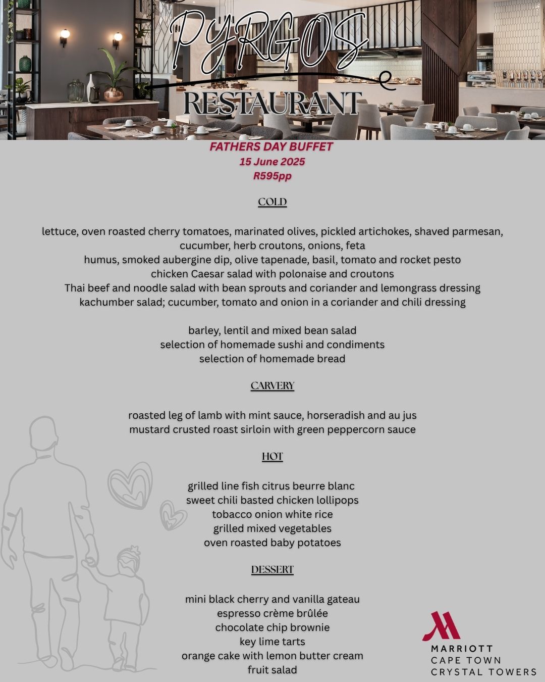 Looking to spoil Dad this Father’s Day? Cape Town Marriott Hotel Crystal Towers has just the plan—and it involves grilled line fish, a roast carvery, sushi, and more dessert than anyone technically needs.