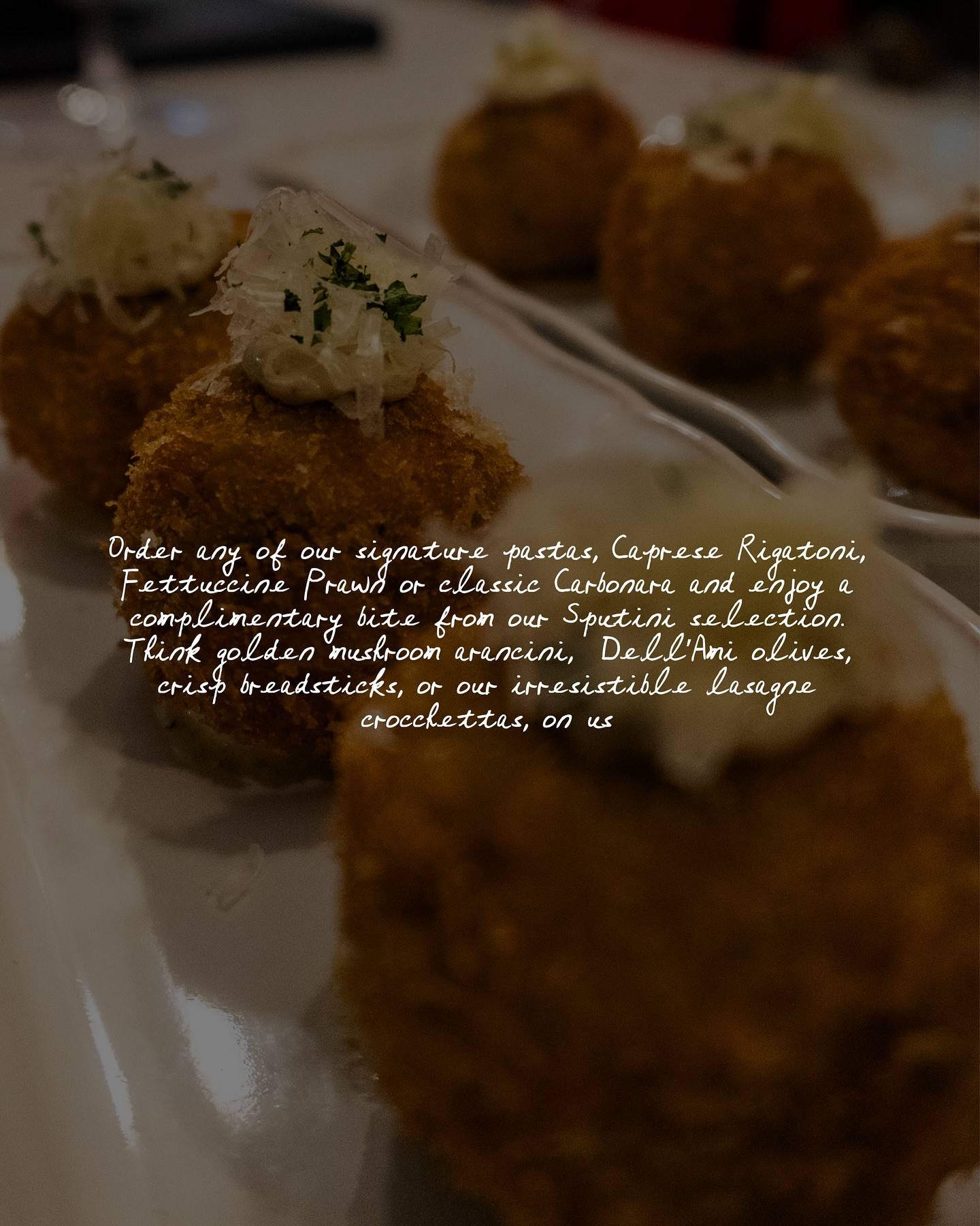 Think golden mushroom arancini with that perfect crunch. Del’Anni-style olives that pack a savoury punch. Crisp breadsticks that beg for a swirl through sauce. Or the fan-favourite: dreamy, cheesy lasagne crochettas—basically a deep-fried love letter to comfort food. All complimentary with your pasta pick.