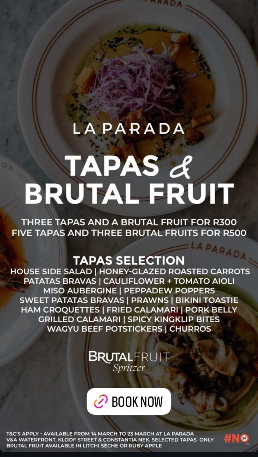 Paired with a Brutal Fruit Spritzer in either Litchi Sèche or Ruby Apple, this combo is made for easygoing indulgence. Available at La Parada V&A Waterfront, Kloof Street, and Constantia Nek, this offer won’t last long—book now and make the most of tapas season!