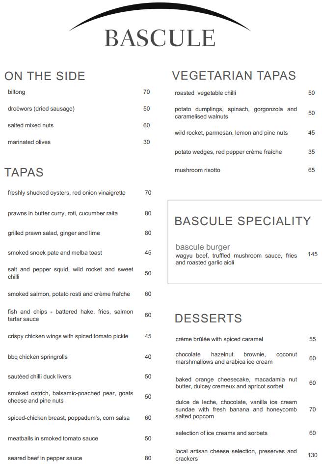 Bascule Bar offers a fantastic menu to enjoy tapas at the V&A Watefront at very reasonable prices. The menu includes oysters, prawns in butter curry, smoked snoek, salt and pepper squid, smoked ostrich and many other dishes.