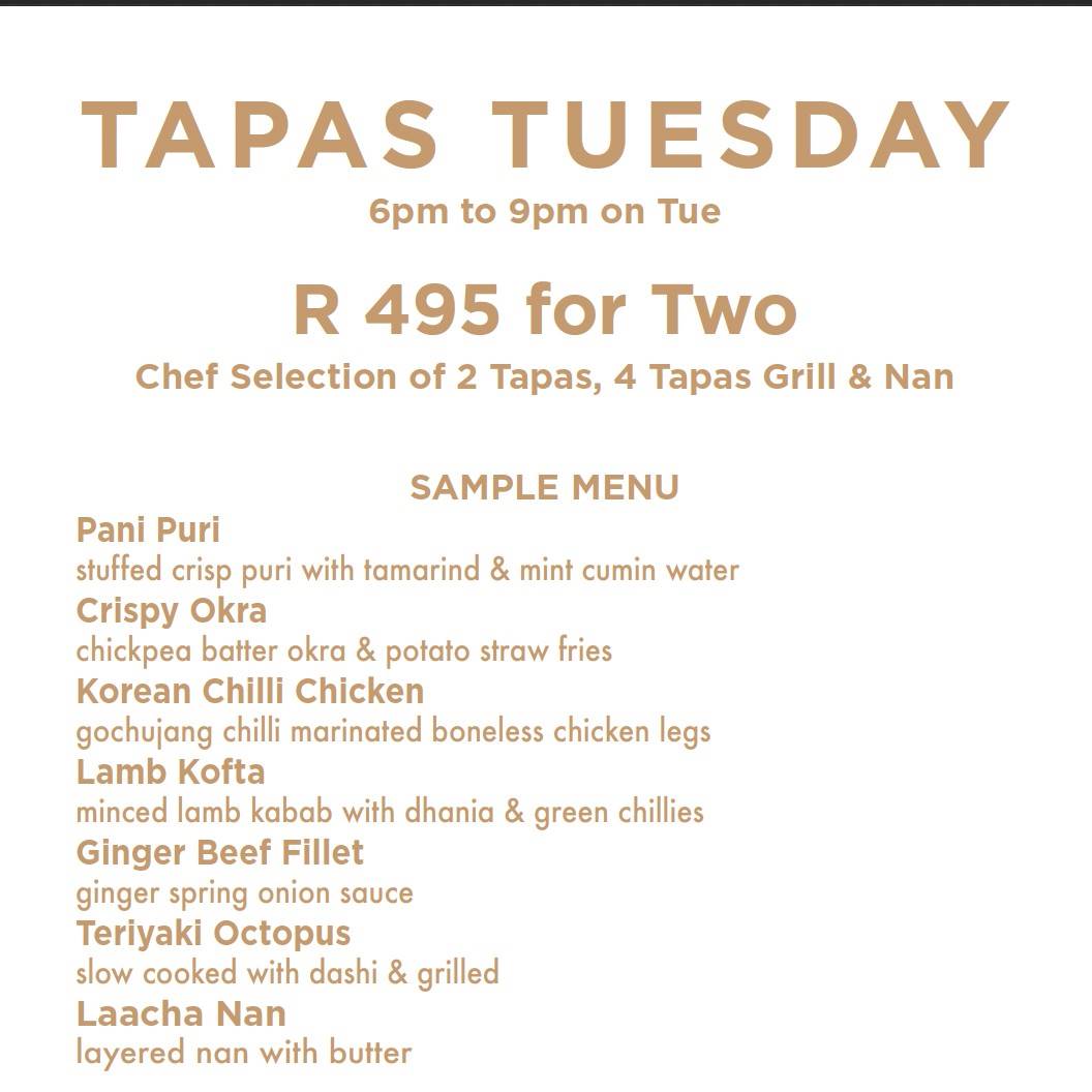 Enjoy a chef’s selection of 2 tapas, 4 tapas grill & naan for only R495.