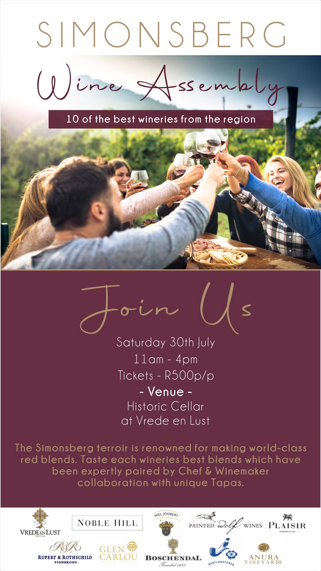 Hosted on the 30th of July in Simondium at the foot of the Simonsberg mountain in the Vrede en Lust historic cellar.