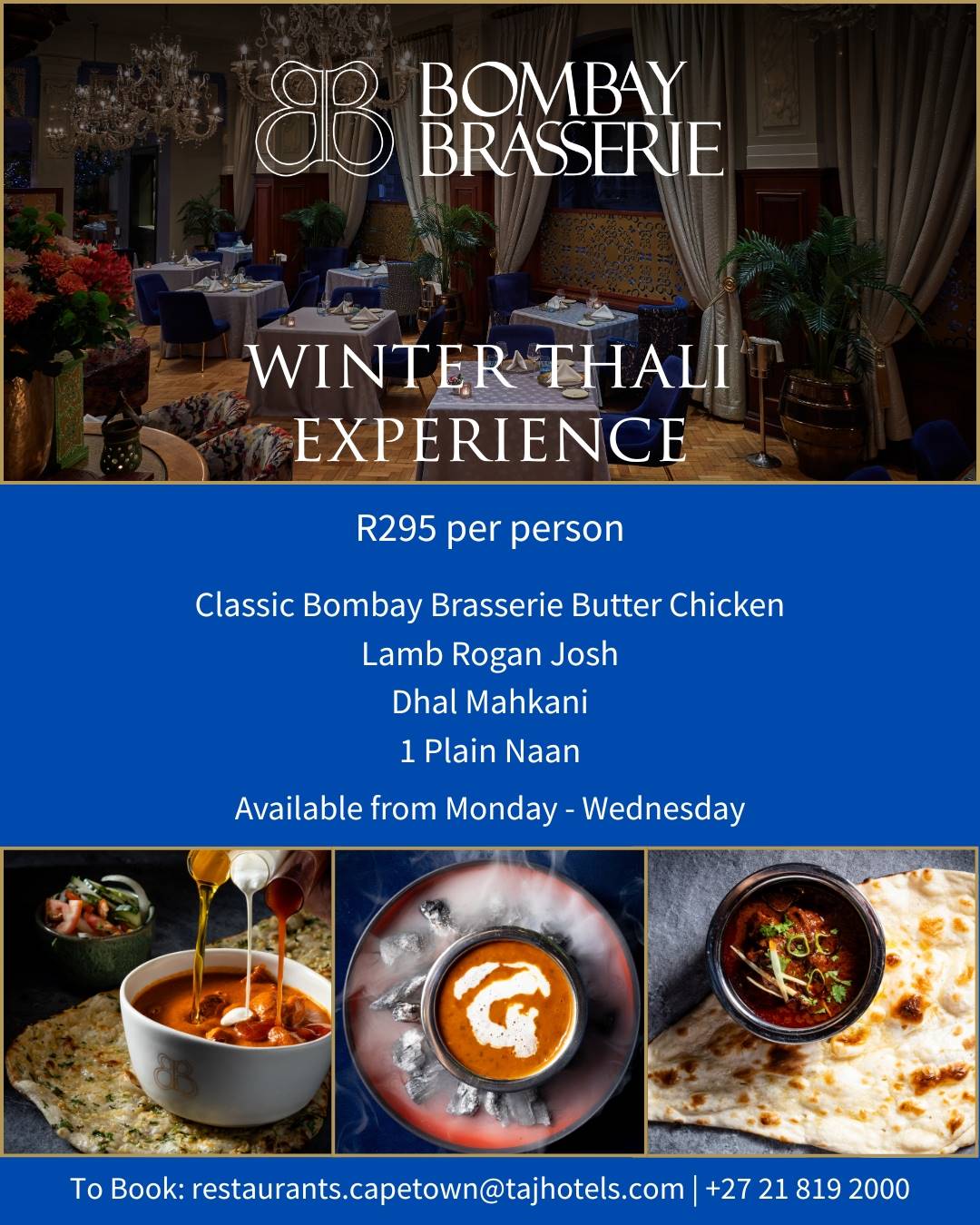 If your week needs a little flavour upgrade, Bombay Brasserie at Taj Cape Town has just the fix. Their Winter Thali Experience is a warm hug in the form of spice, sauce, and serious culinary craftsmanship—all for R295 per person.