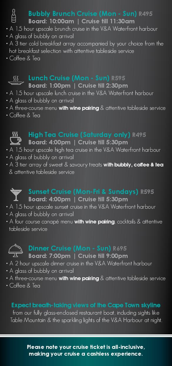 Cruise lengths range between 90 – 120 mins, beginning with four cruises a day with each menu featuring seasonal, locally sourced ingredients are available for your perusal. Choose from bubbly brunches, leisurely lunches as well as sunset and dinner cruises while High Teas are also options. Please see all options highlighted below.
