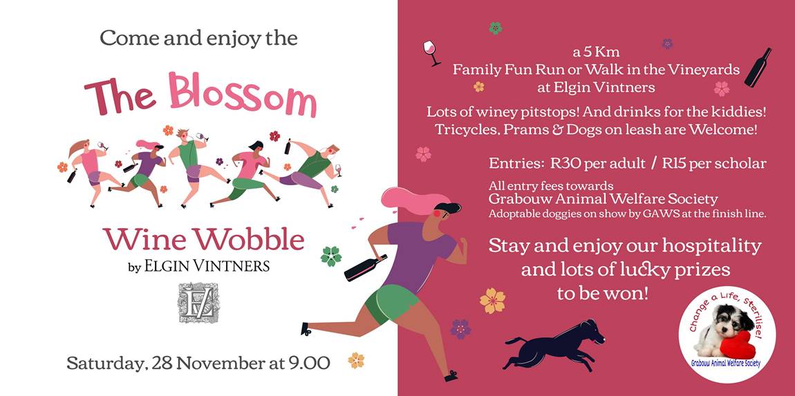 On Saturday, the 28th of November, you can enjoy a 5 km Family Fun Run or Walk in the Vineyards at Elgin Vintners which starts from 9 in the morning. There will be lots of winey pit stops on the way as well as drink options for the little ones. Even tricycles, strollers and very well-behaved dogs on leashes are welcome to join The Blossom Wine Wobble.