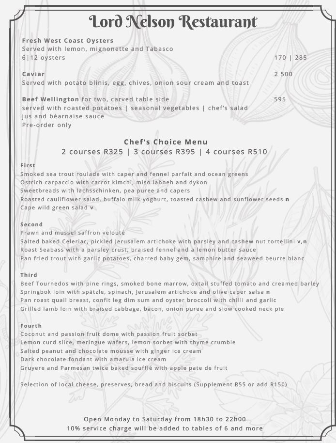 The restaurant is offering a wonderful Chef’s Choice Menu where you can select from 2 courses (R325), 3 courses (395) or 4 courses (R510). With so many options to choose from for each of the courses, you will definitely be in for a exquisite dining experience.