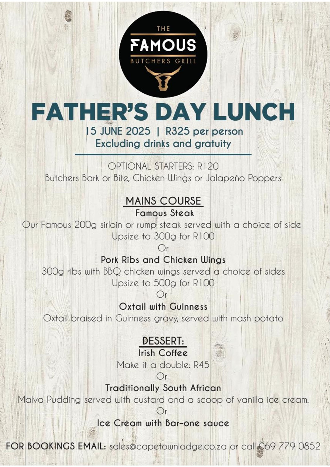 Tables are bound to fill up faster than Dad’s plate at a buffet, so don’t wait. Book via sales@capetownlodge.co.za or call 069 779 0852. This Father’s Day, skip the novelty socks and give the man what he really wants—steak, ribs, oxtail, and a damn good dessert. The Famous Butchers Grill is serving it all, hot and hearty.