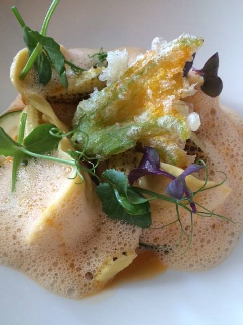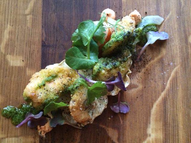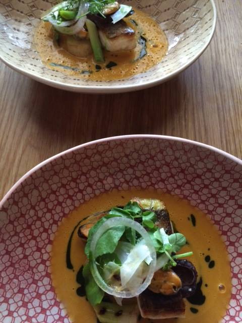 Sauce bouillabaisse, edible mussel shell, grilled leek, shaved fennel, red onion, watercress and pea shoots