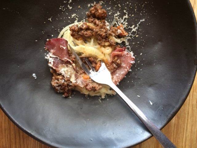 Bolognaise, onion spaghetti, cured Gemsbok bresaola, Klein River Grana and rye crumb