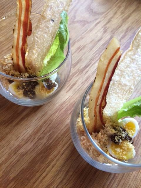 Romaine crème fraiche, quail egg, crispy pancetta, cured yolk, Worcestershire caviar and Parmesan