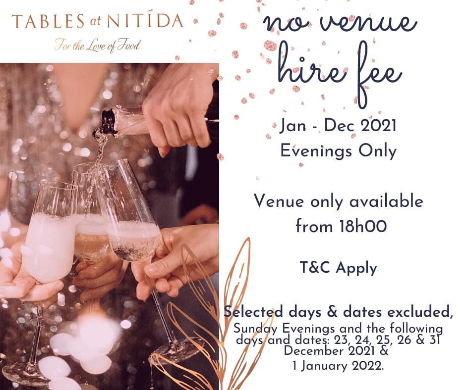 Look no further, as Tables at Nitida has got you covered with no venue hire if you book the venue during the evening for your event.