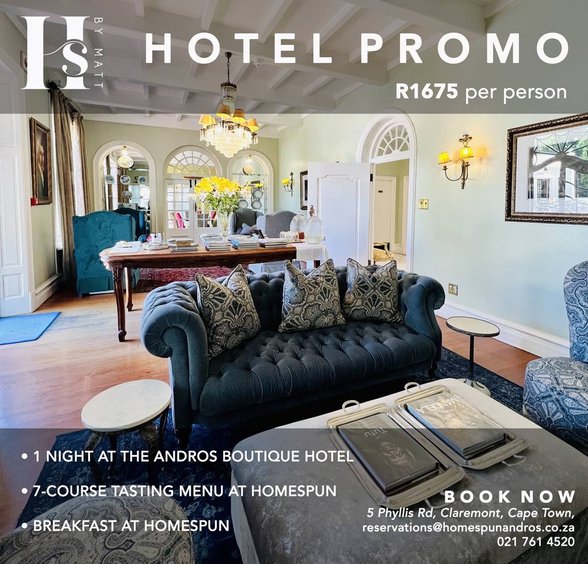 Restaurant bookings to be made directly with the restaurant: reservations@homespunandros.co.za – 021 761 4520