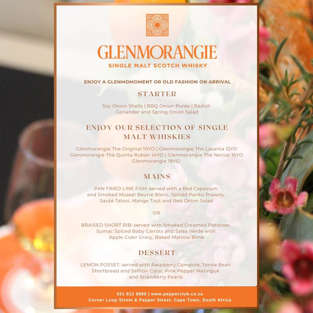 - Each course will be paired with a selection of five of the finest Glenmorangie Single Malt Scotch Whiskeys, offering a tasting experience that is both luxurious and refined. The evening will commence with a tasting of the Glenmorangie 10-year, setting the tone for what promises to be an extraordinary journey through the world of premium whiskey.