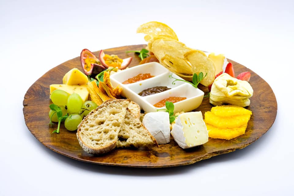 Wonderful for sharing, this platter offers camembert with Cape gooseberry and ginger preserve, mature cheddar with apple and kumquat chutney, Goats chevin with fig and raisin chutney.