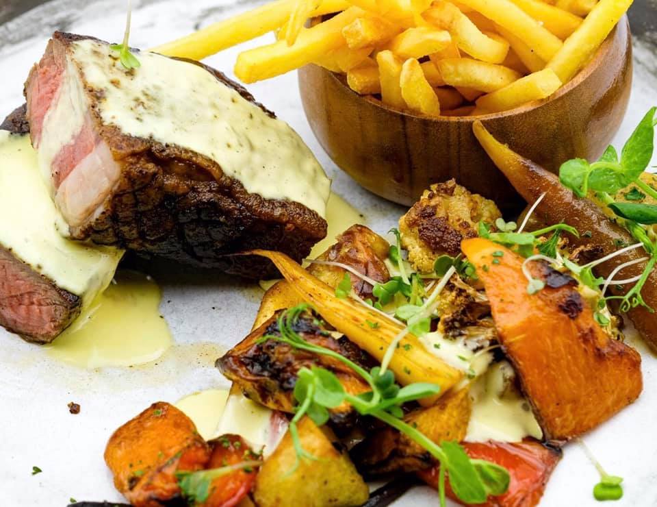 Tender sirloin or rump steak grilled to perfection, frites, roasted vegetables and sauce béarnaise – it’s a generous, filling lunch.