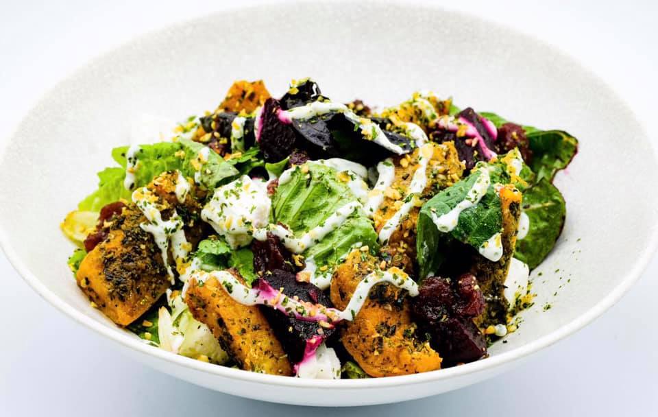 A beautifully light meal of roast butternut, baby beetroot, mixed leaves, goat’s feta jalapeno yoghurt, dried cranberry relish, toasted pumpkin seed gremolata.