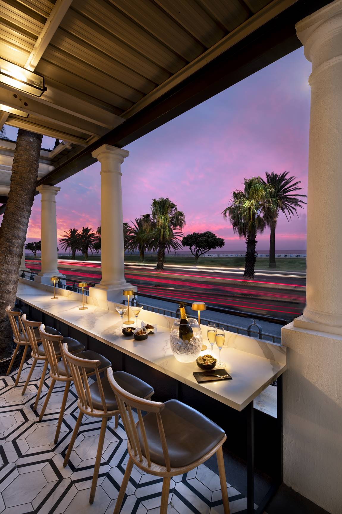 Relaunching in time for festive season dining, the refurbished Shoreditch Restaurant interior has petrol blue leather booths, charcoal-coloured walls and oversized parasol-style lampshades in a vibrant coral hue. These pendant lights add an unexpected twist of colour, cocooning each dining space as evening unfolds. French doors open onto the balcony overlooking the Atlantic Ocean where the coastal-colonial feel is reinforced by towering palm trees interspersing the tables. A beautiful marble bar opens from the restaurant onto the Winchester Hotel’s courtyard. This area, with its vivid magenta bougainvillea and monochrome patterned floor tiles, is one of Cape Town’s most Instagramable dining spaces.