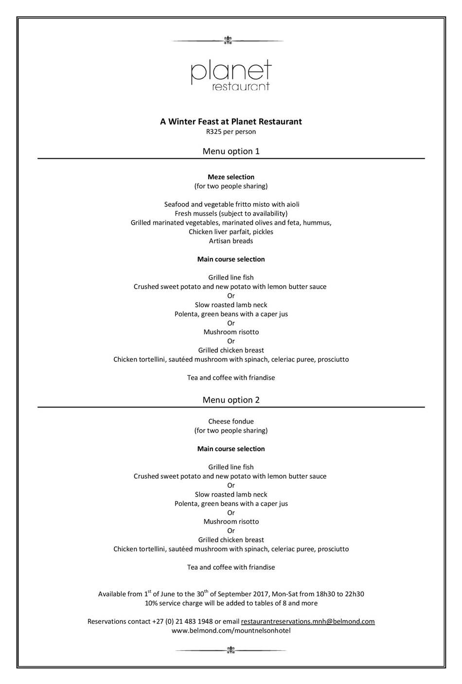 A special winter themed menu is served from June through September, every Monday – Saturday from 6:30 to 10:30pm. Available for only R325 per person, it includes two courses, including tea, coffee and friandise.