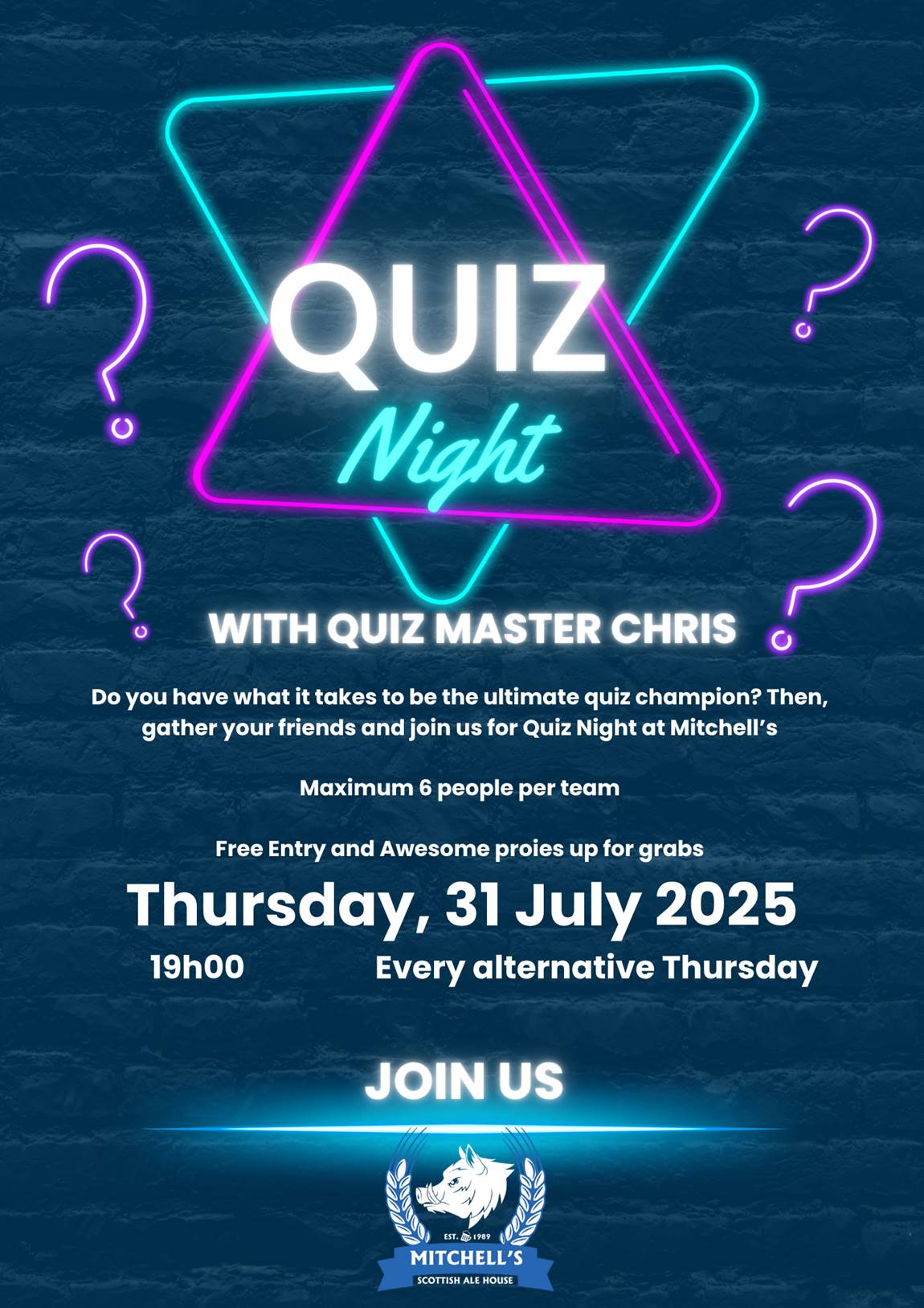 So, rally your crew, charge your mental batteries, and come out swinging. Quiz Night at Mitchell’s isn’t just about knowing things – it’s about good times, great food, and even better company. Let’s get quizzical.